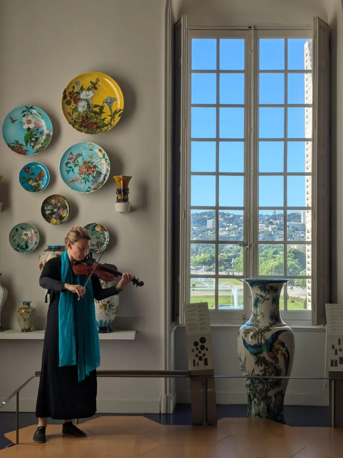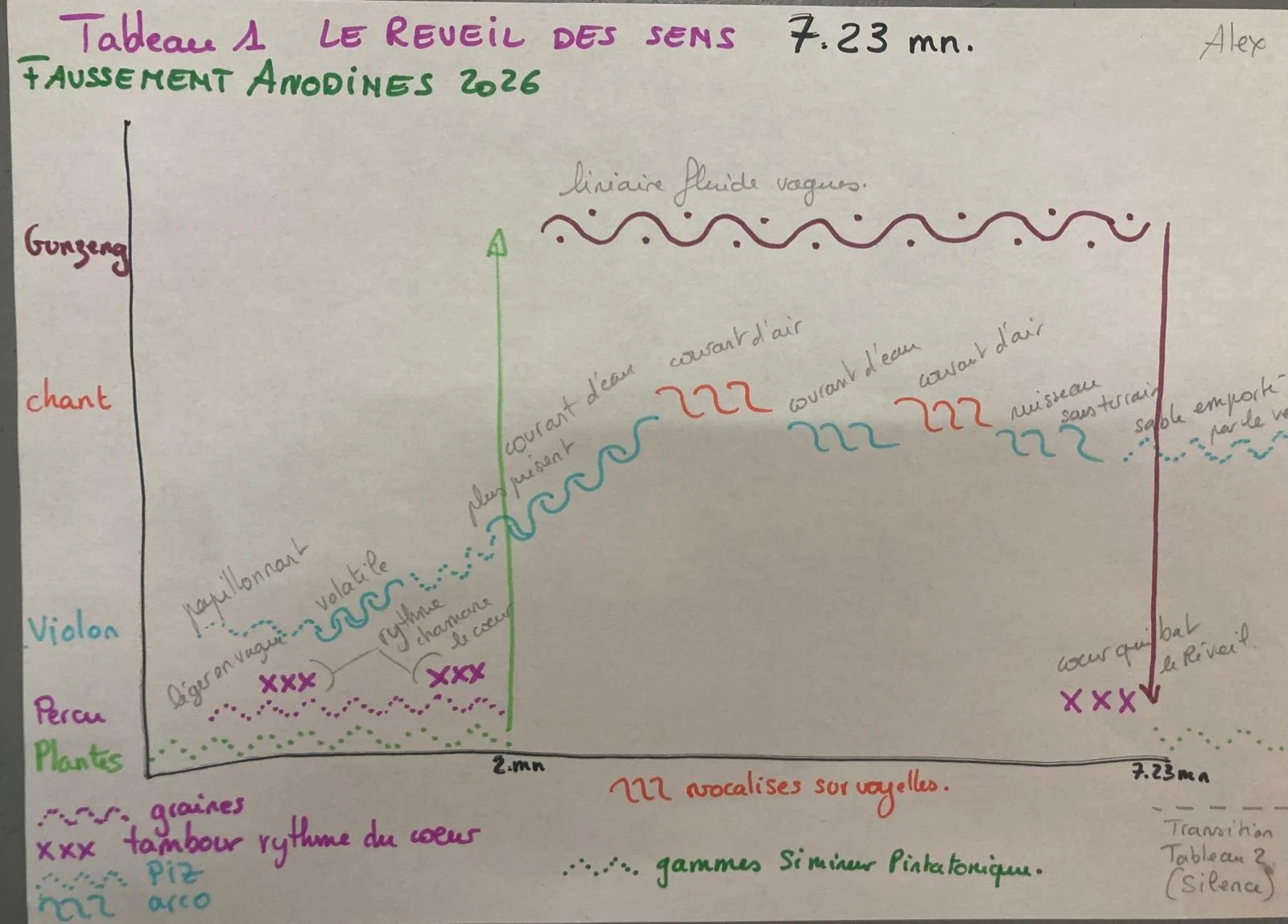 Iris Le Fur : Mon travail visuel et sonore est en perpétuelle interaction. C’est une pensée synesthésique. Lorsque je joue des sons immédiatement les images, les formes, les couleurs arrivent et inversement. Quand je peint, les sons les rythmes sont dans ma tête. Tout est en correspondance perpétuelle. Il a fallu du temps pour mettre en place une pratique dans le travail qui puisse me permettre d’alterner entre la production visuelle et la production sonore. J’ai mis en place mon atelier avec aussi bien mon matériel de peinture, de dessin, de modelage, de Papier Végétal, que mes instruments de musique, le piano, la harpe, les instruments à percussions, les flûtes et le violon bien sûr. Il faut que tout soit présent pour qu’au moment précis où j’en ai besoin, il y ai le moins de contraintes pratiques pour faire place à la pensée qui surgit.