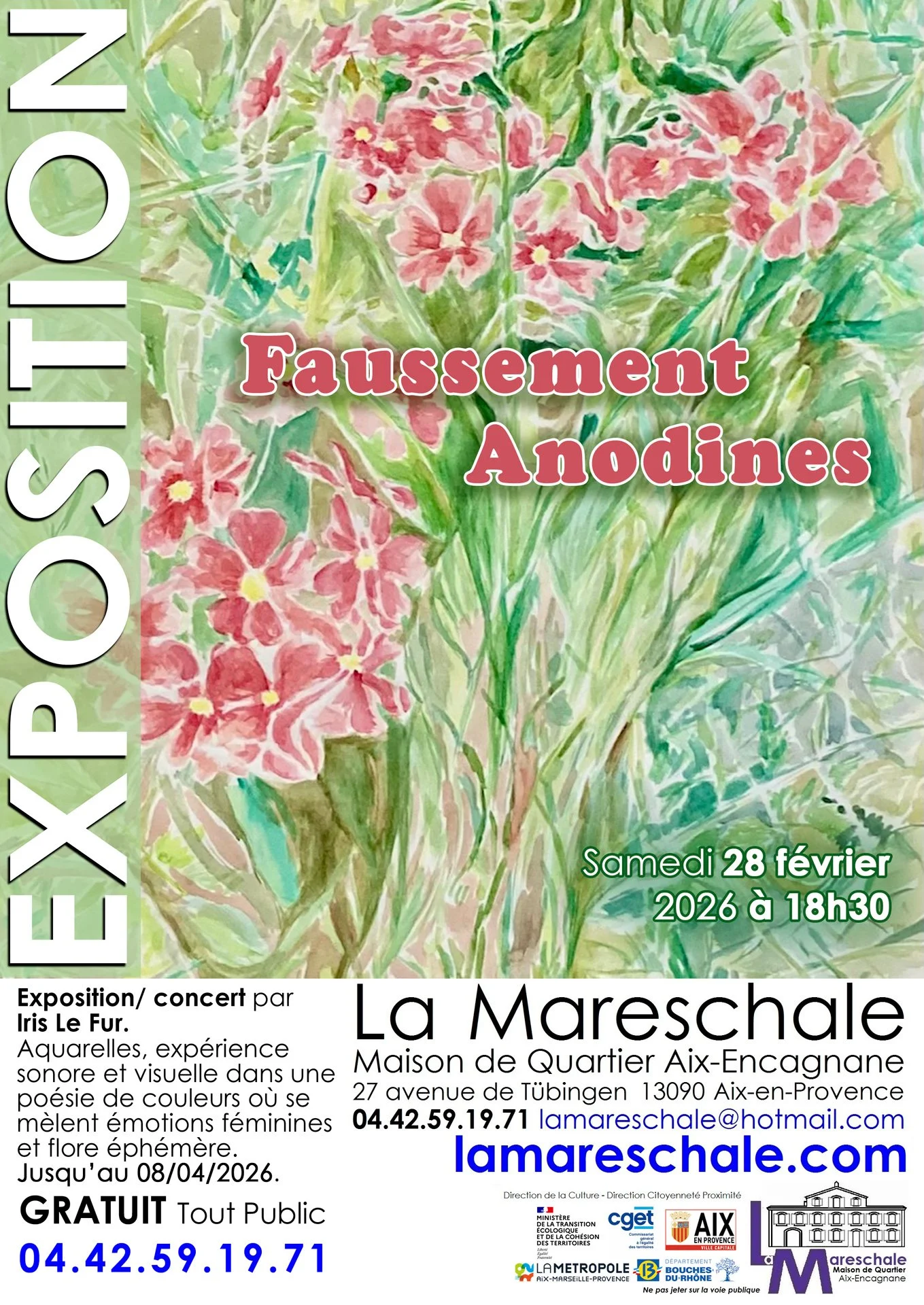 Iris Le Fur : Cette série de tableaux pour l’exposition faussement anodine est un travail que j’ai commencé en 2023 qui a déjà été exposé à la galerie Pail Chez Anne à l’Estaque. J’avais à cœur de continuer cette série qui propose des grandes aquarelles, représentant tout d’abord Des Fleurs de bord de chemin et en réserve des corps féminins. La réserve c’est cette partie blanche du papier qui est laissé sans aquarelle et qui laisse deviner les contours de pieds d’épaule, de mains, de visage. Il s’agit de traduire plastiquement les pensées féminines, ces petits issus de conversation avec soi-même qui défile dans l’intimité d’un instant et qui sont le terreau de notre féminité de notre intimité. Entre fragilité et femmes amazones une multitude de contrastes se met à jour dans ses interstices avec soi-même, que j’essaye de capter à travers des taches de couleur. J’ai choisi les fleurs des bords de chemin car , comme ses pensées, elles paraissent anodines sans grande utilité alors qu’elles sont indispensables à tout un équilibre.
