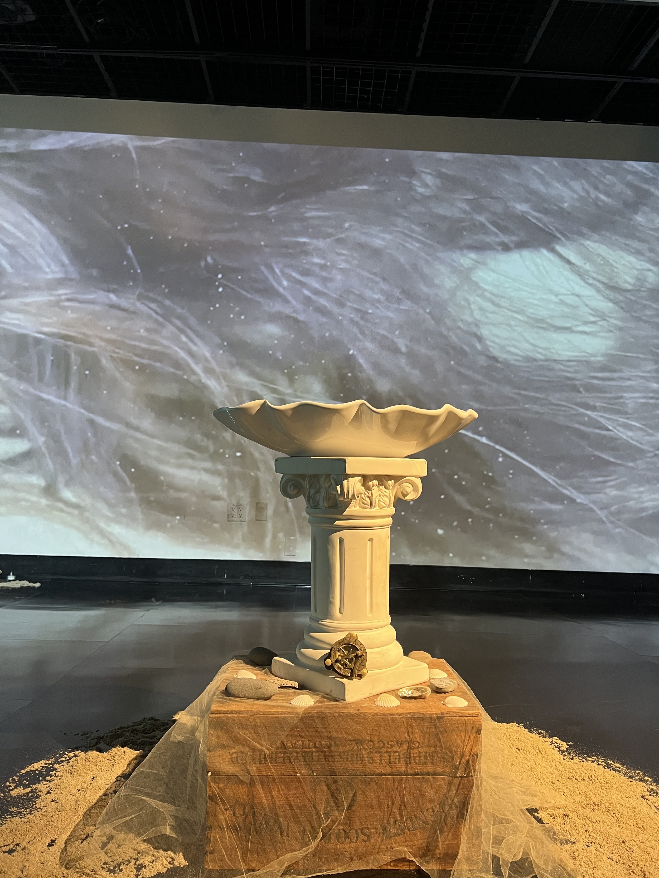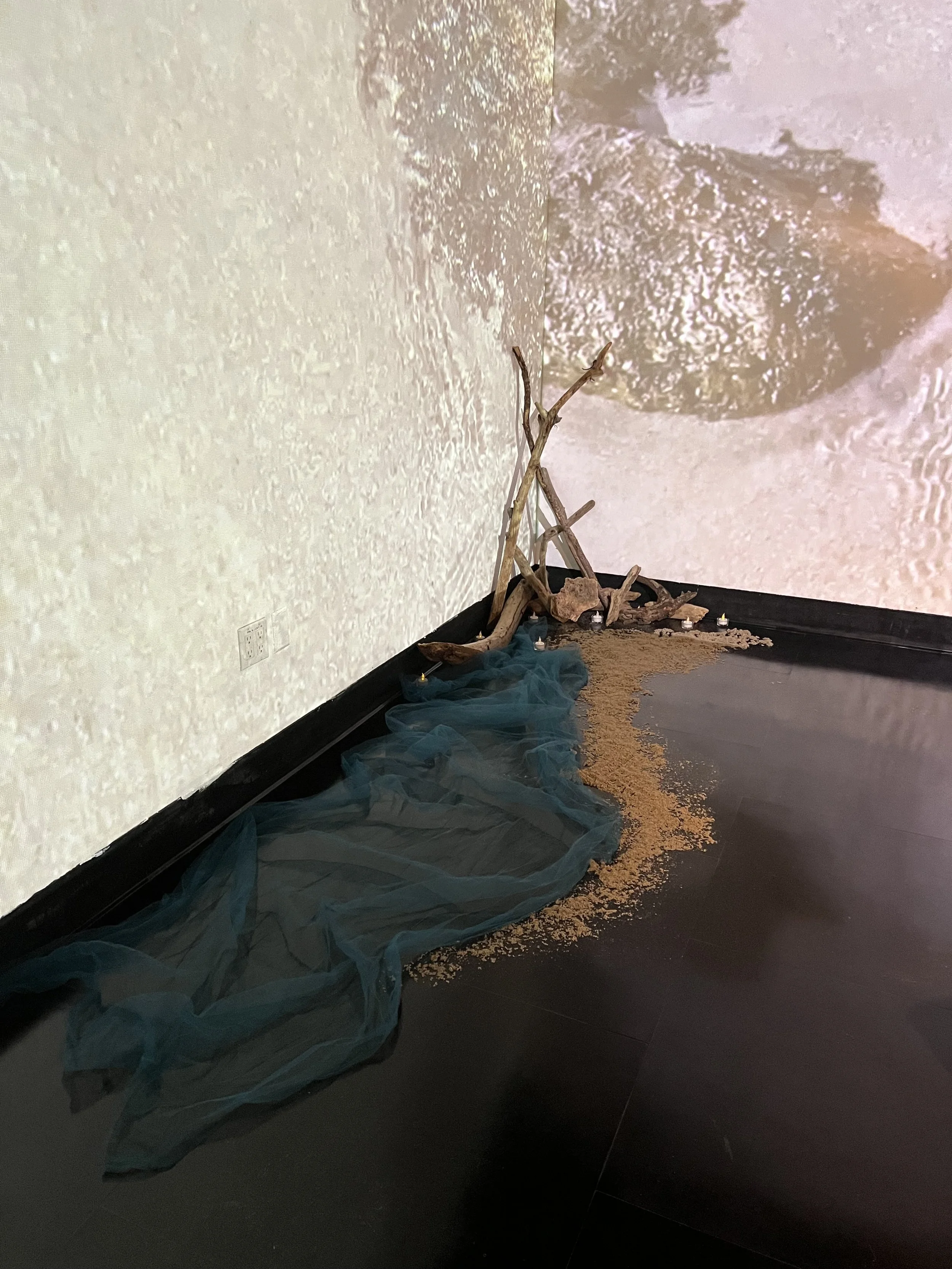 Alisha: This was the first visual art installation I’ve ever done, and I’m so grateful to have been granted the space by California Institute of the Arts (CalArts). Since we were missing Alex and Margo being there with us in-person, I definitely had moments of grief or feeling anxious because I wanted to have their input more directly. But the physicality of putting this together added a deeper understanding of how I think we were all relating to the piece too. Katy and I went to the beach and (comedically) carried tubs of ocean water and sand, we foraged driftwood and shells, and received pieces for the altar from friends. It all felt very collaborative and immersive to be building with elements we were showcasing in the film.